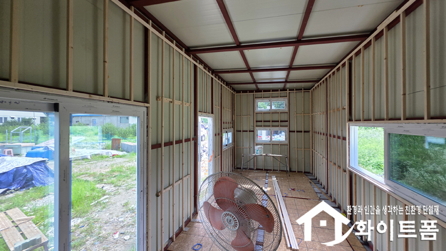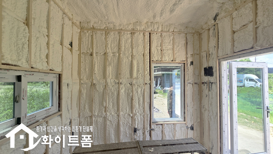신축중인 이동식주택 2동 내부 벽면, 천장, 바닥에 친환경 단열재 화이트폼(수성연질폼)을 시공 했습니다.