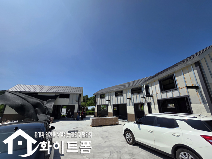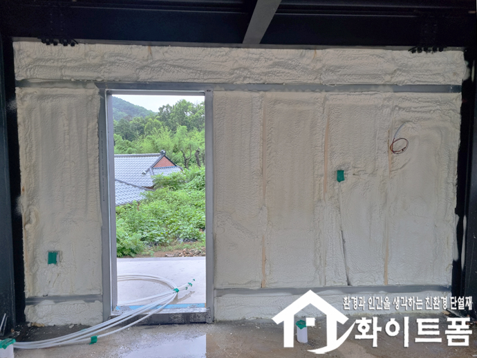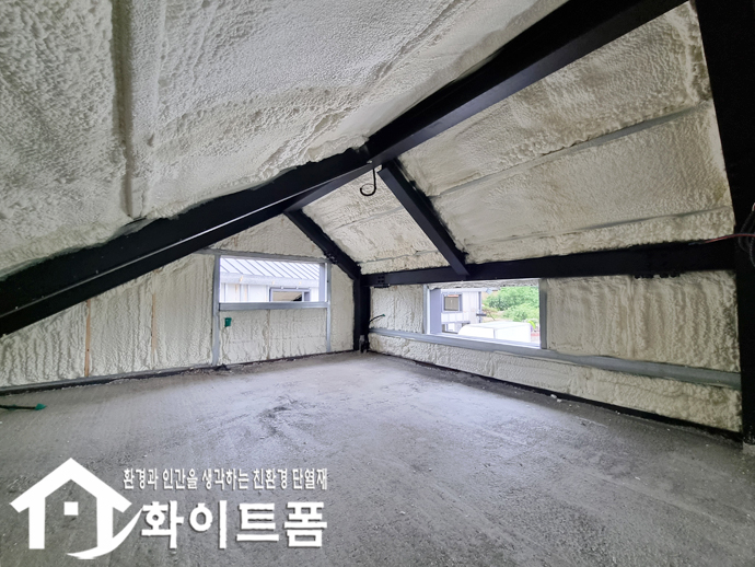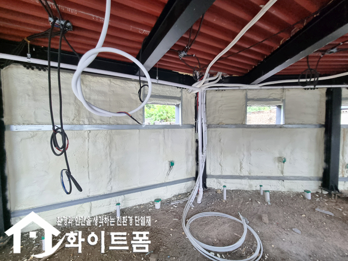 신축중인 건물 2동 내부 벽면과 천장에 친환경 단열재 화이트폼(수성연질폼)을 시공 했습니다.