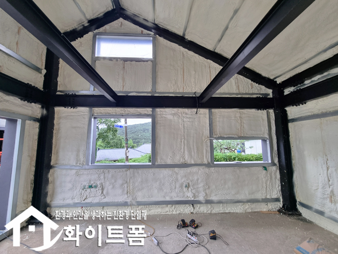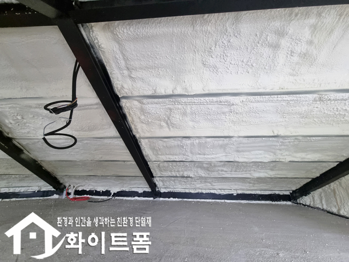 이런 화이트폼(수성연질폼)을 스프레이 건으로 단열이 필요한 부위에 발포하게 되면 5초 이내에 100배로 부풀어 오르면서 양생이 되는데, 부풀어 오른 폼이 판넬과 판넬사이는 물론 철골과 만나는 모서리 작은 틈새까지 부드럽게 차고 들어가 틈새를 모두 메워주기 때문에 단열성 높은 건물을 만들 수 있습니다.