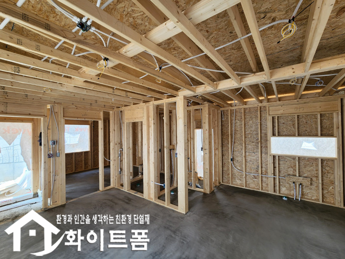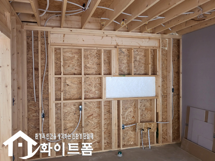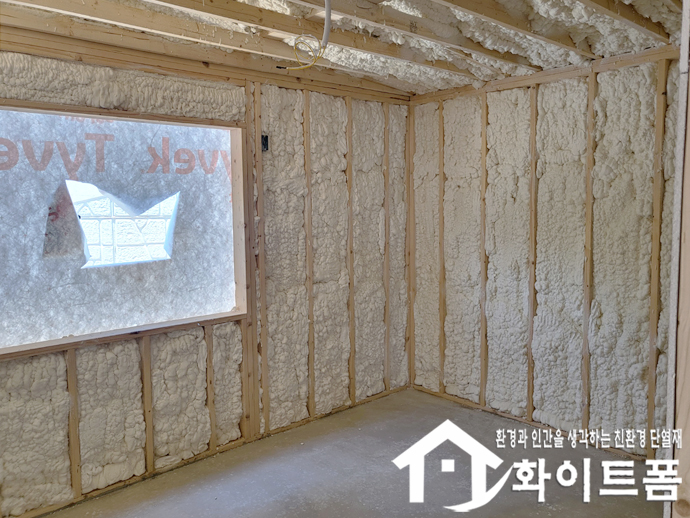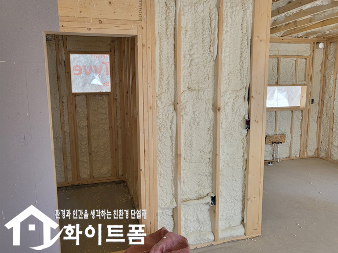 신축중인 목조주택 내부 벽면과 천장에 친환경 단열재 화이트폼(수성연질폼)을 시공 했습니다.