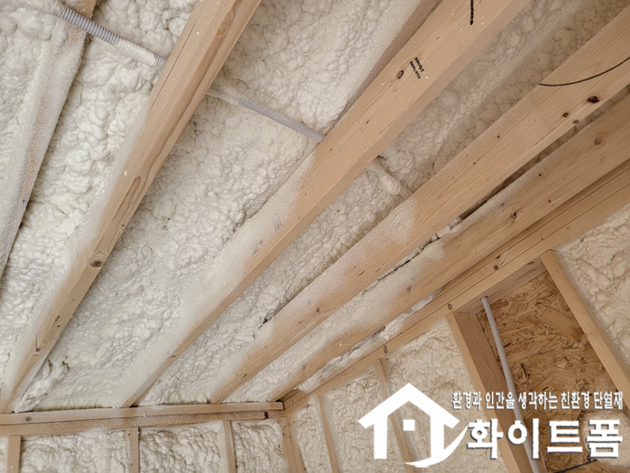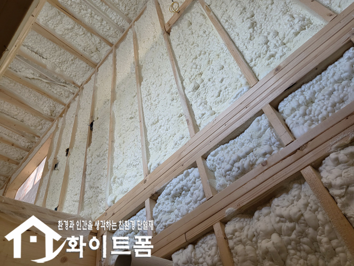 이런 화이트폼(수성연질폼)을 스프레이 건으로 단열이 필요한 부위에 발포하게 되면 5초 이내에 100배로 부풀어 오르면서 양생이 되는데, 부풀어 오른 폼이 목재 사이사이 작은 틈새까지 부드럽게 차고 들어가 단열 처리를 해주기 때문에 단열성 높은 공간을 만들 수 있습니다.