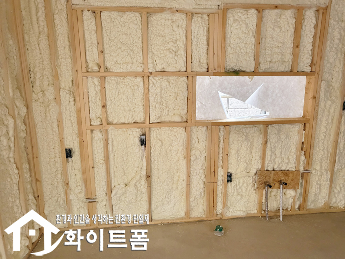이렇게 친환경 제품이면서 난연 단열재인 화이트폼(수성연질폼)은 습기와 온도에 강해 날씨와 계절에 관계없이 시공이 가능하며, 적은 인력으로도 짧은 시간 안에 빈틈없이 기밀한 단열시공을 할 수 있어 공사기간을 단축할 수 있습니다.