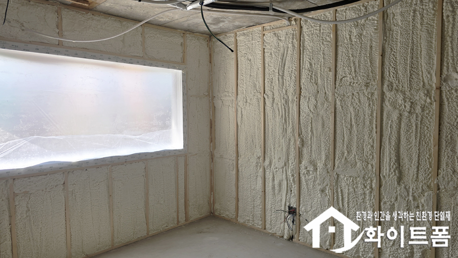 리모델링 중인 단독주택 내부 벽면과 천장에 친환경 단열재 화이트폼(수성연질폼)을 시공 했습니다.
