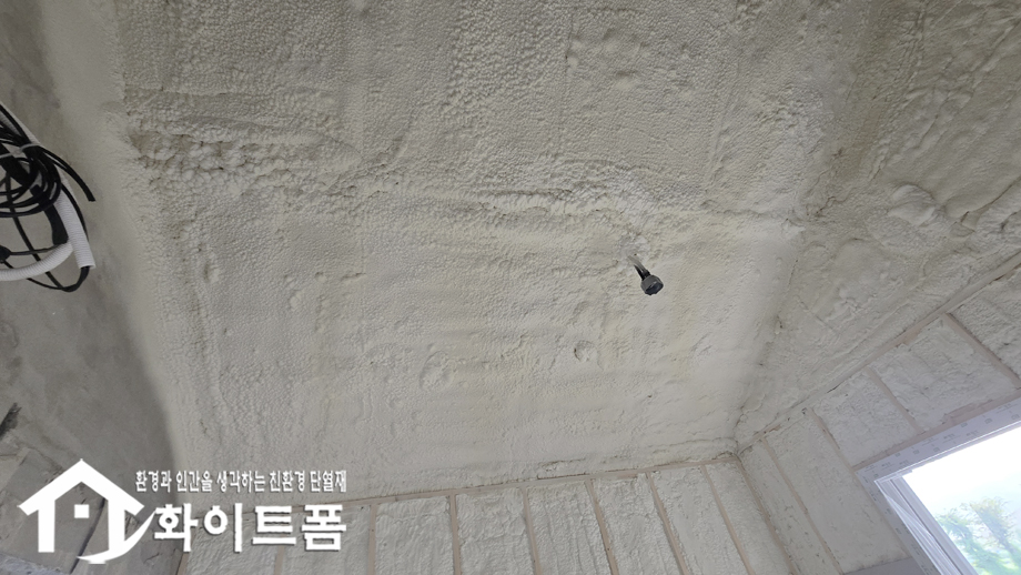 이런 화이트폼(수성연질폼)을 스프레이 건으로 단열이 필요한 부위에 발포하게 되면 5초 이내에 100배로 부풀어 오르면서 양생이 되는데, 부풀어 오른 폼이 구석진 좁은 틈새까지 부드럽게 차고 들어가 일반 단열재로는 보완할 수 없는 작고 좁은 틈새 부분까지 기밀하게 단열처리를 할 수 있어 단열성 높은 공간을 만들 수 있습니다.